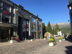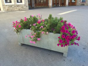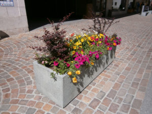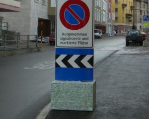 Verkehrstafelsockel, Blumentröge und Bänke, Via Serlas, St. Moritz